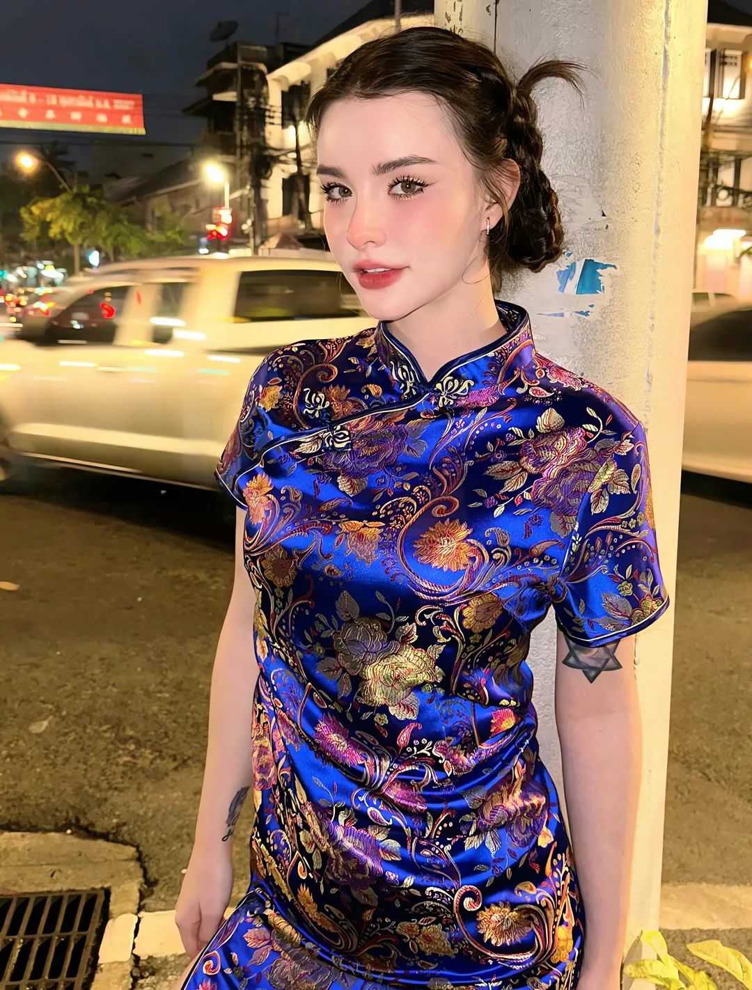 In a grand ballroom with crystal chandeliers hanging from the ceiling, the model waltzes across the floor in a long, silk gown with a voluminous skirt. Her partner’s hand is clasped firmly around her waist, and their synchronized movements create a beautiful display of fluidity. The light from the chandeliers catches the sequins on her dress, making her sparkle with every turn. In another shot, she poses alone, one leg extended gracefully behind her, her arms held in a poised position. The ornate architecture of the ballroom, with its arched windows and intricate moldings, serves as a perfect backdrop for her elegance.
